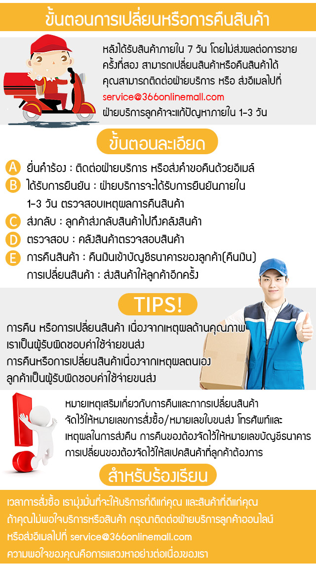 ร้านเรามีบริการเก็บเงินปลายทาง จัดส่งฟรี สามารถคืนหรือเปลี่ยนสินค้าภายใน 7 วันนับตั้งแต่วันที่ได้รับสินค้า แถมยังมีบริการออนไลน์ตลอดเวลา